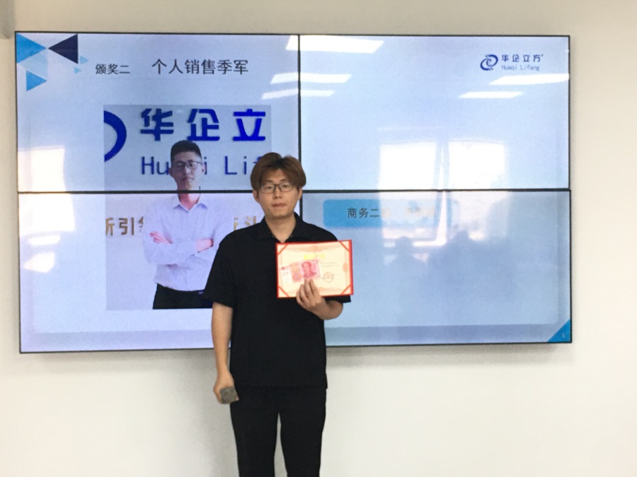 接下来颁发的是个人销售季军奖:他年龄不大,司龄也不高,但是他自加入公司以来,业绩便一路飘红,展现了非凡的潜力,凭借不懈的努力和解决问题的能力,展现了卓越的职业精神他就是商务二部李鹏鹏。